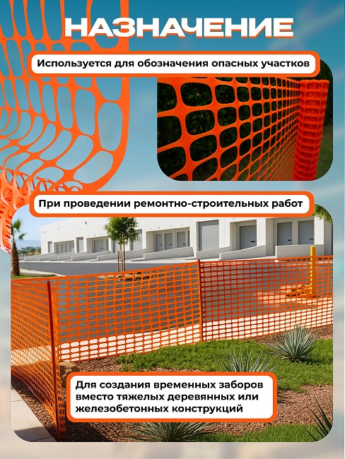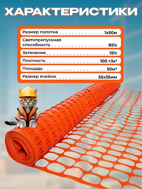 Аварийное ограждение 1х50 м используется для обозначения опасных участков при проведении ремонтно-строительных работ, а также для создания временных заборов вместо тяжелых деревянных или железобетонных конструкций. Сетка аварийная изготавливается из светостабилизированного пластика яркого оранжевого цвета, хорошо отражает свет и обращает на себя внимание в любое время суток при различной погоде. За счет больших ячеек размером 55х35 мм и малого веса без проблем устанавливается при помощи пластиковых хомутов, проволоки или шпагата на участках проведения работ. Для монтажа пластиковой сетки нужен один человек. Сетка пластиковая легко очищается, не выгорает и подходит для многократного использования.