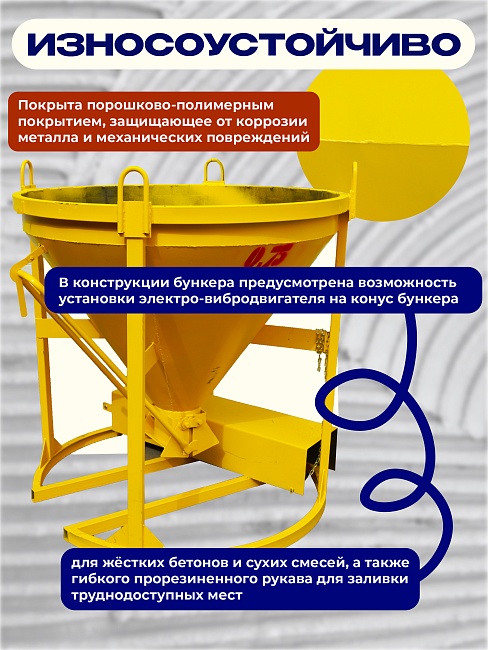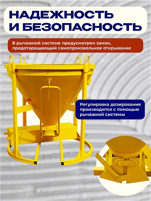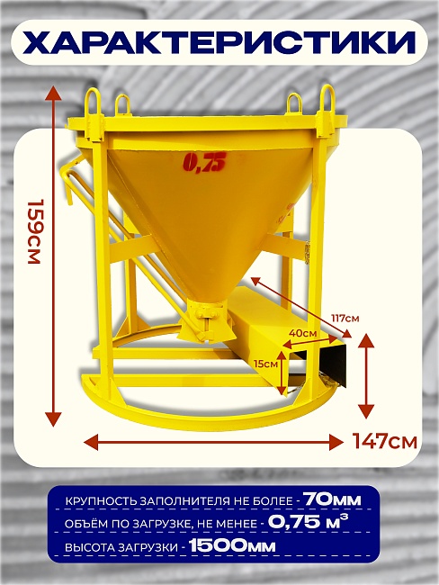 Бадья для бетона БН 0,75 м3 с лотком используется для кратковременного хранения и транспортировки бетонной смеси, других строительных растворов к месту непосредственного использования.