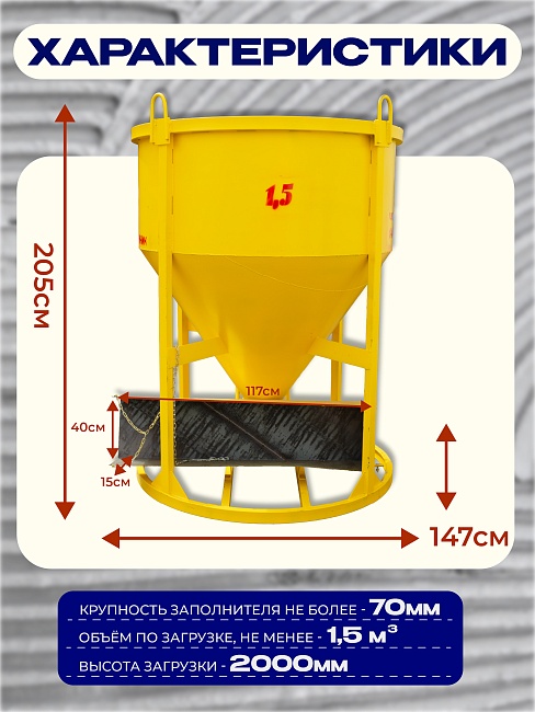 Бадья для бетона БН 1,5 м3 с лотком используется для кратковременного хранения и транспортировки бетонной смеси, других строительных растворов к месту непосредственного использования.
