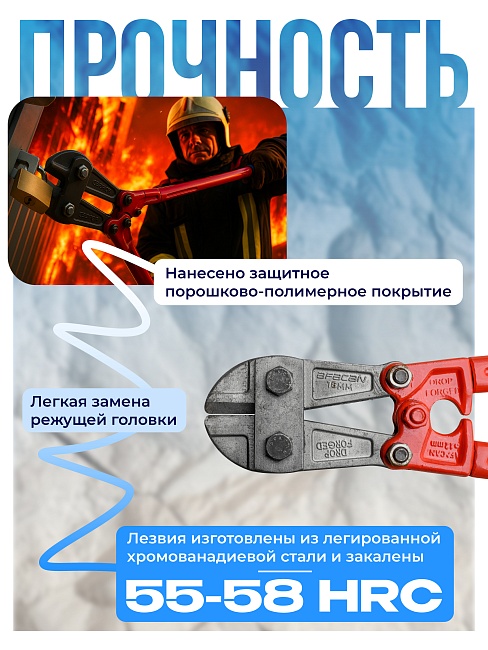 Болторез TeaM 12В служит для удаления болтов различного типа, перерубания тросов, проволок, металлических стержней. Длинные рычажные рукоятки оснащены эргономичными накладками, для более комфортного выполнения работ. Лезвия изготовлены из специальной легированной хромованадиевой стали и закалены до 55-58 HRC. Ручки оптимально передают усилие на режущие кромки. Максимальный диаметр прута 12 мм.