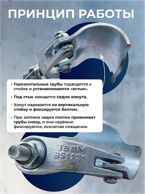 Поворотные хомуты – это элемент конструкции строительных хомутовых лесов, предназначенный для жесткой фиксации вертикальных стоек и горизонтальных связей. Обеспечивает надежное соединение, повышая прочность конструкции и безопасность при возведении ЛСХ. Этот вид хомутов скрепляет элементы лесов под любым углом (острым или тупым), что особенно удобно при работе с сооружениями сложной конфигурации (исторические здания, церкви и др.).