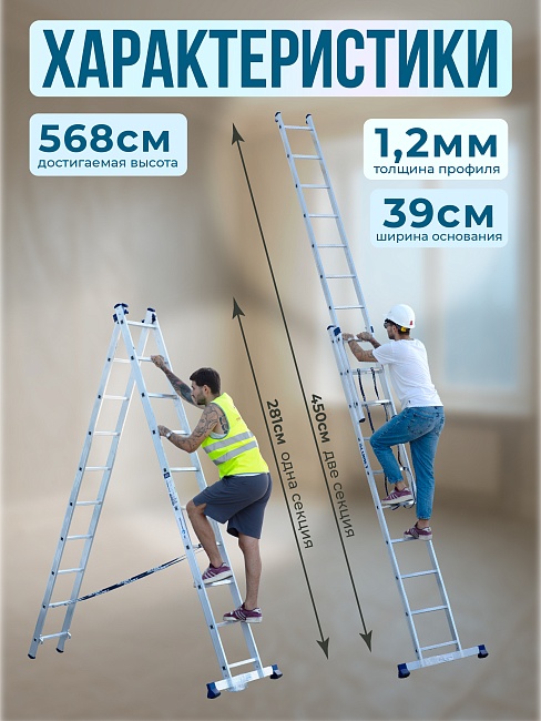 Двухсекционная лестница серии Ал 5210 – это многофункциональная конструкция, которая может использоваться как обычная стремянка, так и как приставная лестница, благодаря специальным шарнирам. В каждой секции содержится по 10 ступеней.