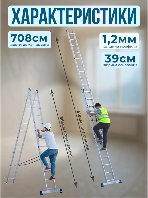 Двухсекционная лестница серии Ал 5213 – это многофункциональная конструкция, которая может использоваться как обычная стремянка, так и как приставная лестница, благодаря специальным шарнирам. В каждой секции содержится по 13 ступеней.