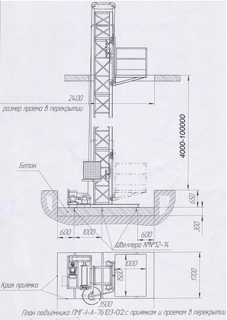 Мачтовый подъемник ПМГ г/п-1000 кг применяется для подъема и подачи различных грузов на крышу или через проем внутрь здания. Мачта подъемника собирается из секций и крепится к стене здания или шахты специальными захватами.