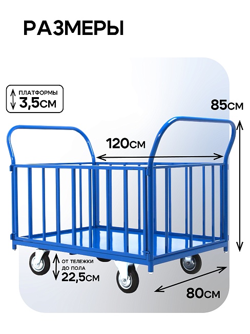 Главная Техника для склада>Грузовые тележки для склада>Платформенные тележки Платформенная тележка 1200х800 ПБ-8.12 160 мм с трубчатыми бортами