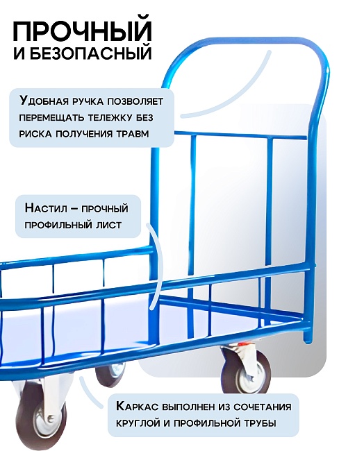 Платформенная тележка с двумя ручками и четырьмя колесами 200 мм предназначена для работы по перевозке грузов на складах, логистических центрах, объектов торговли и прочих мест, где необходимо перевозить товары весом до 550 килограмм. Каркас выполнен из сочетания круглой и профильной трубы. Настил – прочный профильный лист. Удобная ручка позволяет перемещать тележку без риска получения травм. Размер платформы - 1200х600 мм, высота платформы от земли - 30 мм. Тележка покрыта порошково-полимерной краской для защиты от коррозии и механических повреждений. В комплект входит полный набор метизов для сборки изделия.