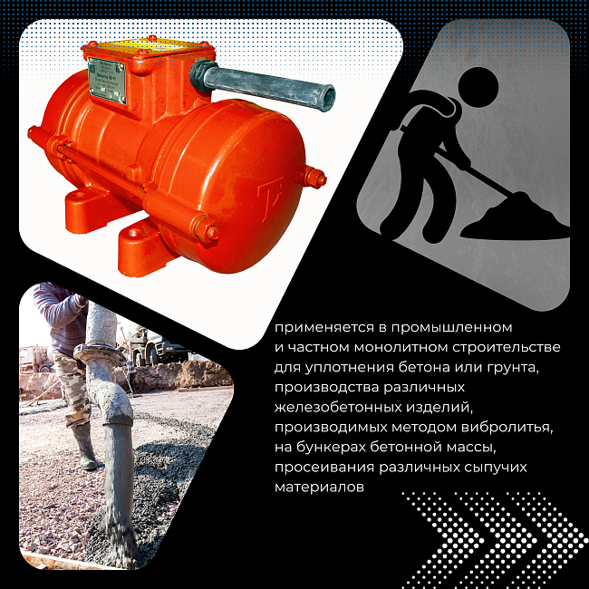 Площадочный вибратор ЭВ-99/42 применяется в промышленном и частном монолитном строительстве для уплотнения бетона или грунта, производства различных железобетонных изделий, производимых методом вибролитья, на бункерах бетонной массы, просеивания различных сыпучих материалов.
