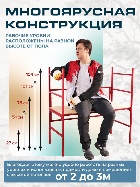 Подмости малярные складные многоярусные H104 эконом предназначены для выполнения ремонтных, строительных и отделочных работ. Компактные в сложенном виде, они легко хранятся и транспортируются, заменяя малярный стол, верстак или стеллаж для инструментов. Прочная конструкция и универсальность делают их идеальным выбором для работы на объектах с высотой потолков до 3,0 м.