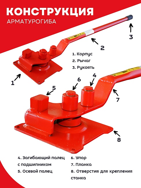 Ручной станок для гибки арматуры Afacan 12PT предназначен для работы с холодной арматурной сталью. Арматурогиб сгибает гладкую и рифленую арматуру диаметром от 6 до 12 мм под заданным углом (в том числе по несколько прутков одновременно, но в сумме диаметров не более 12 мм). Ускоряет процесс производства элементов из арматуры и стали для опалубки, будущих кованных изделий и других технических деталей.