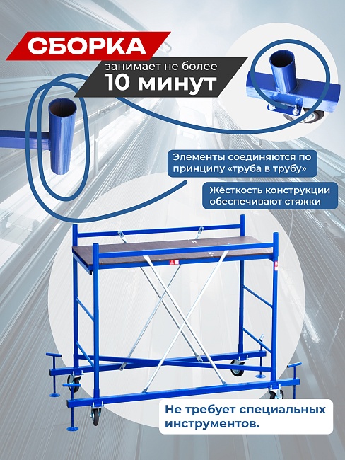 Конструкция легко собирается и разбирается. Изготовлена из электросварной трубы диаметром 42 мм. Все элементы окрашены методом порошковой окраски, что обеспечивает надежное защитное покрытие с отличными декоративными свойствами. Диагонали покрыты цинком для защиты от коррозии и износа. Настил выполнен из фанеры толщиной 12 мм и оснащен люком для безопасного и удобного доступа во время работы. Конструкция выдерживает нагрузку до 250 кг.