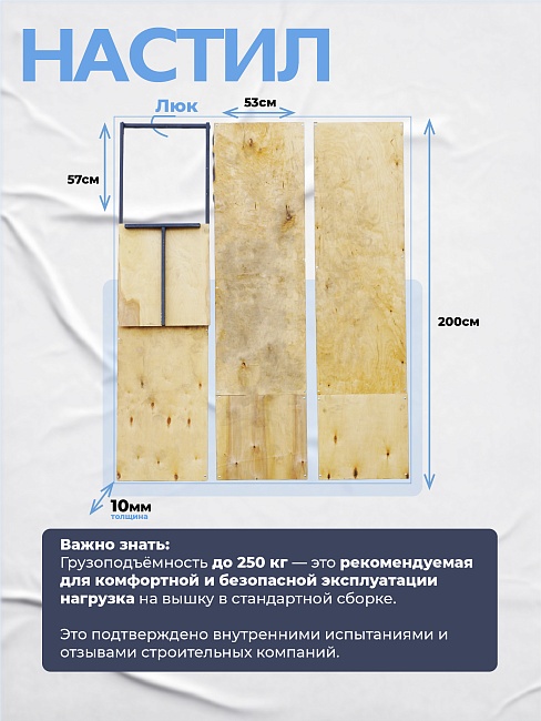 Вышка-тура Дачник Профи представляет собой усовершенствованную версию популярной модели вышки, разработанную специально для профессионального использования. Главное отличие этой модели – применение прочного 12-миллиметрового влагостойкого настила из фанеры повышенной плотности. В отличие от фанеры стандартной модели, эта платформа абсолютно не боится воздействия влаги, перепадов температур и других неблагоприятных погодных условий, сохраняя свою форму и прочность на протяжении всего срока эксплуатации. Такой настил не прогибается под весом до 250 кг